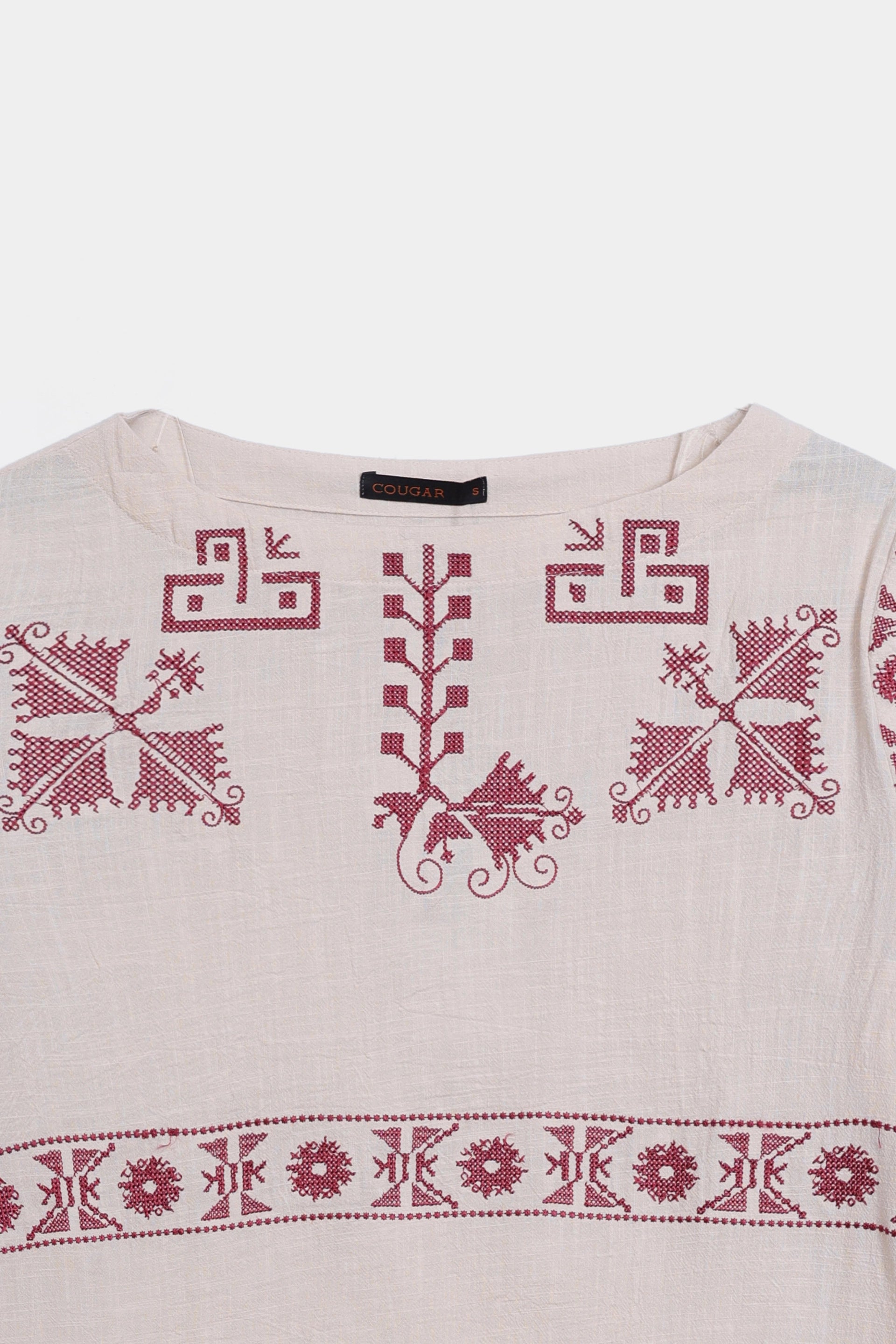 Design Details: Boat neck, short sleeves, geometric embroidery pattern