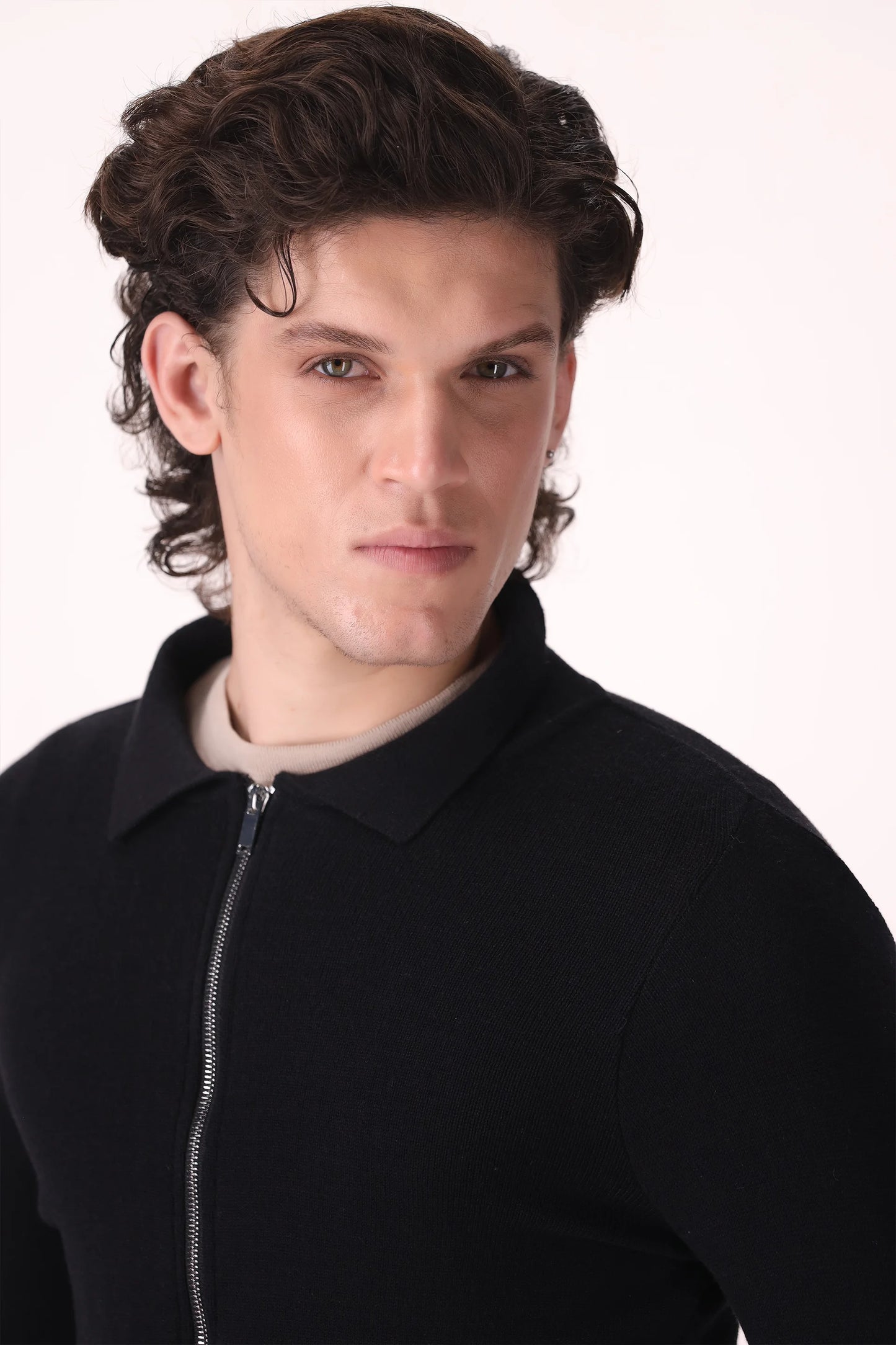 Design Details: Front contrast zipper, straight-cut hem, collared, ribbed trims, knit, full sleeves