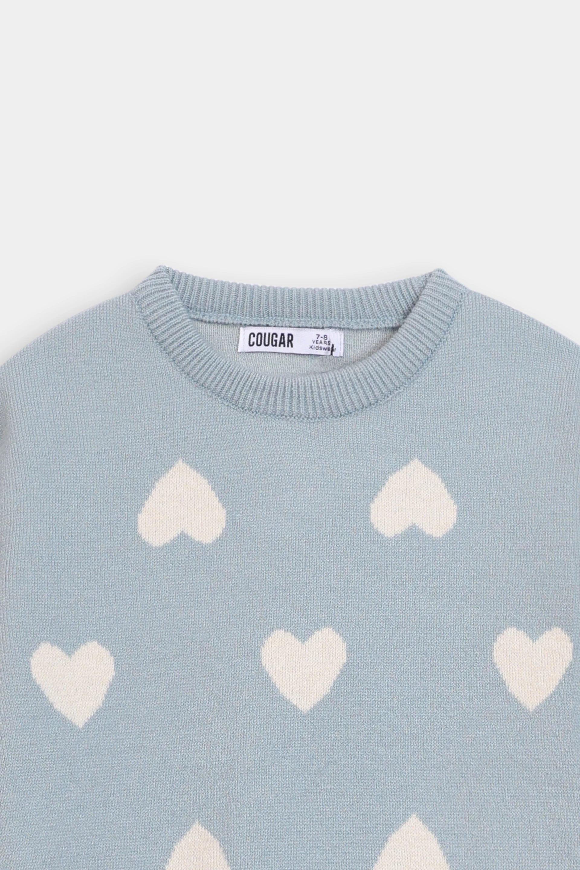 Design Details: Crew neck, heart pattern jacquard knit, rib trims