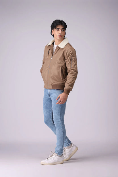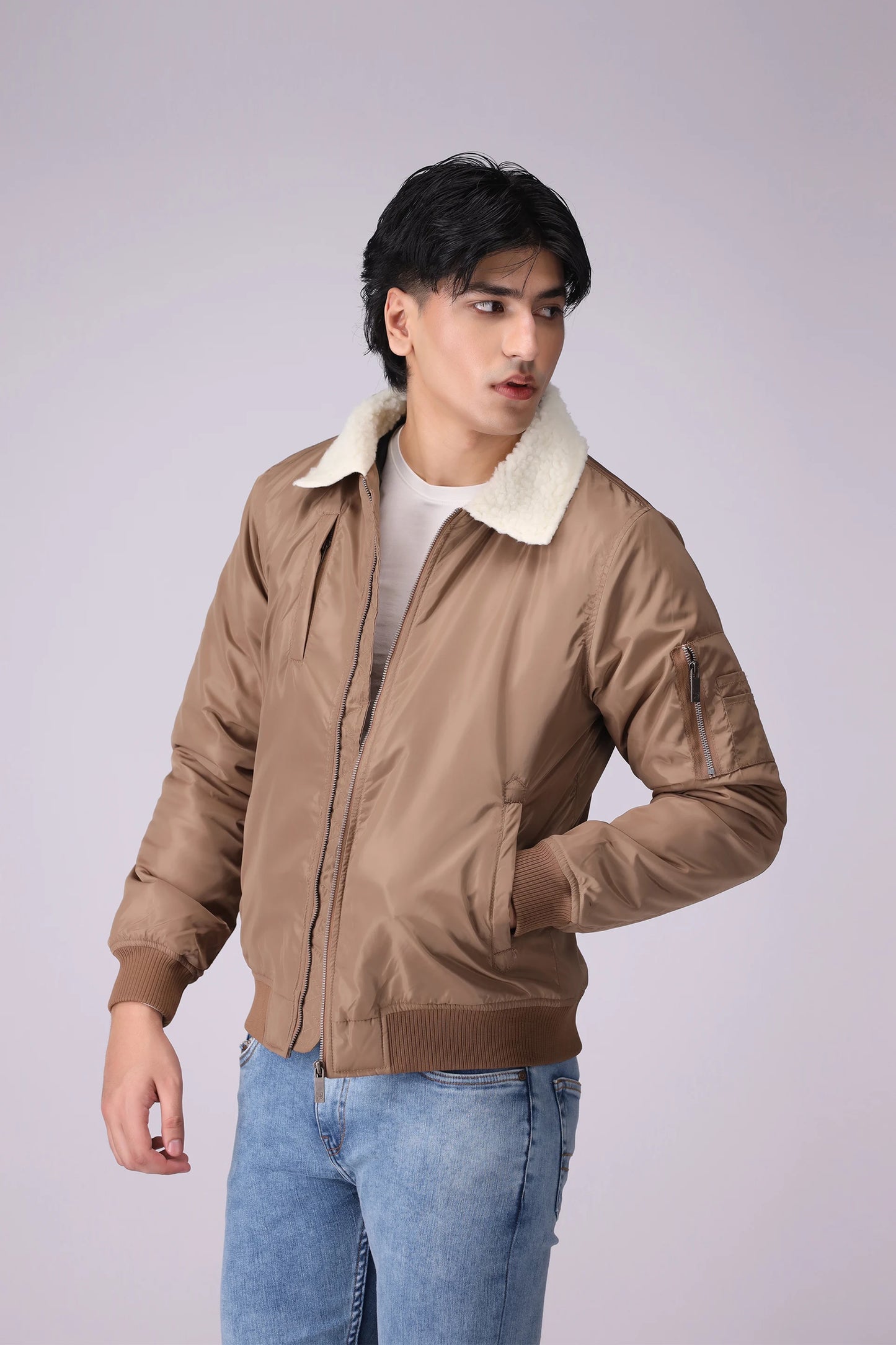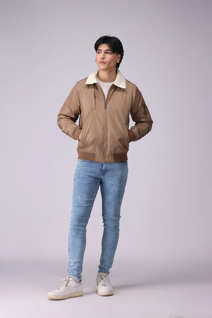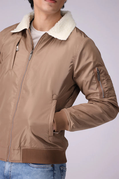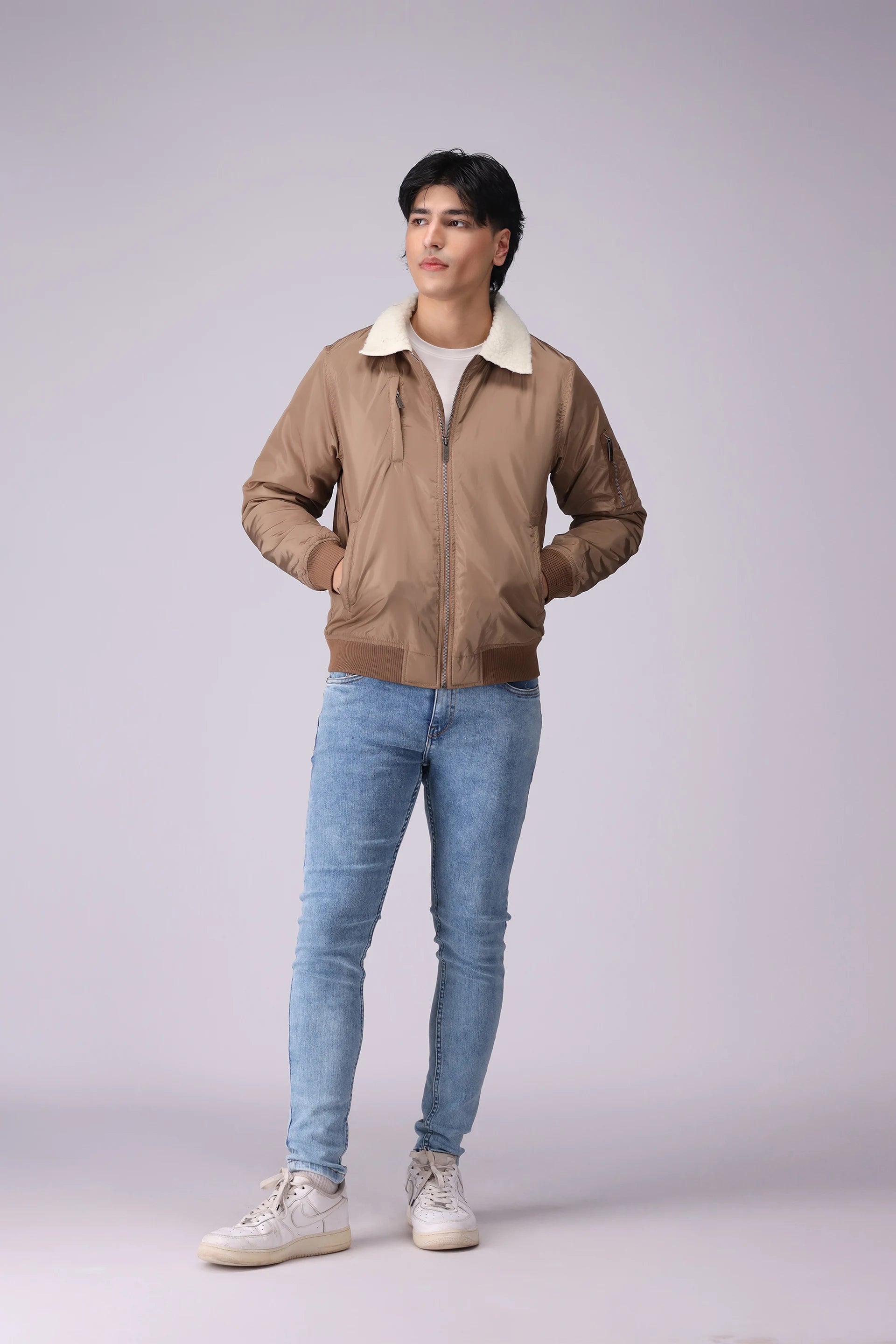 Design Details: Contrast Sherpa collar, ribbed trims, zipper pockets