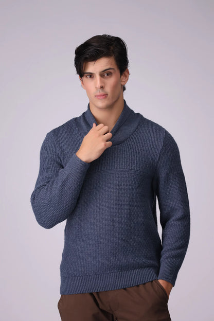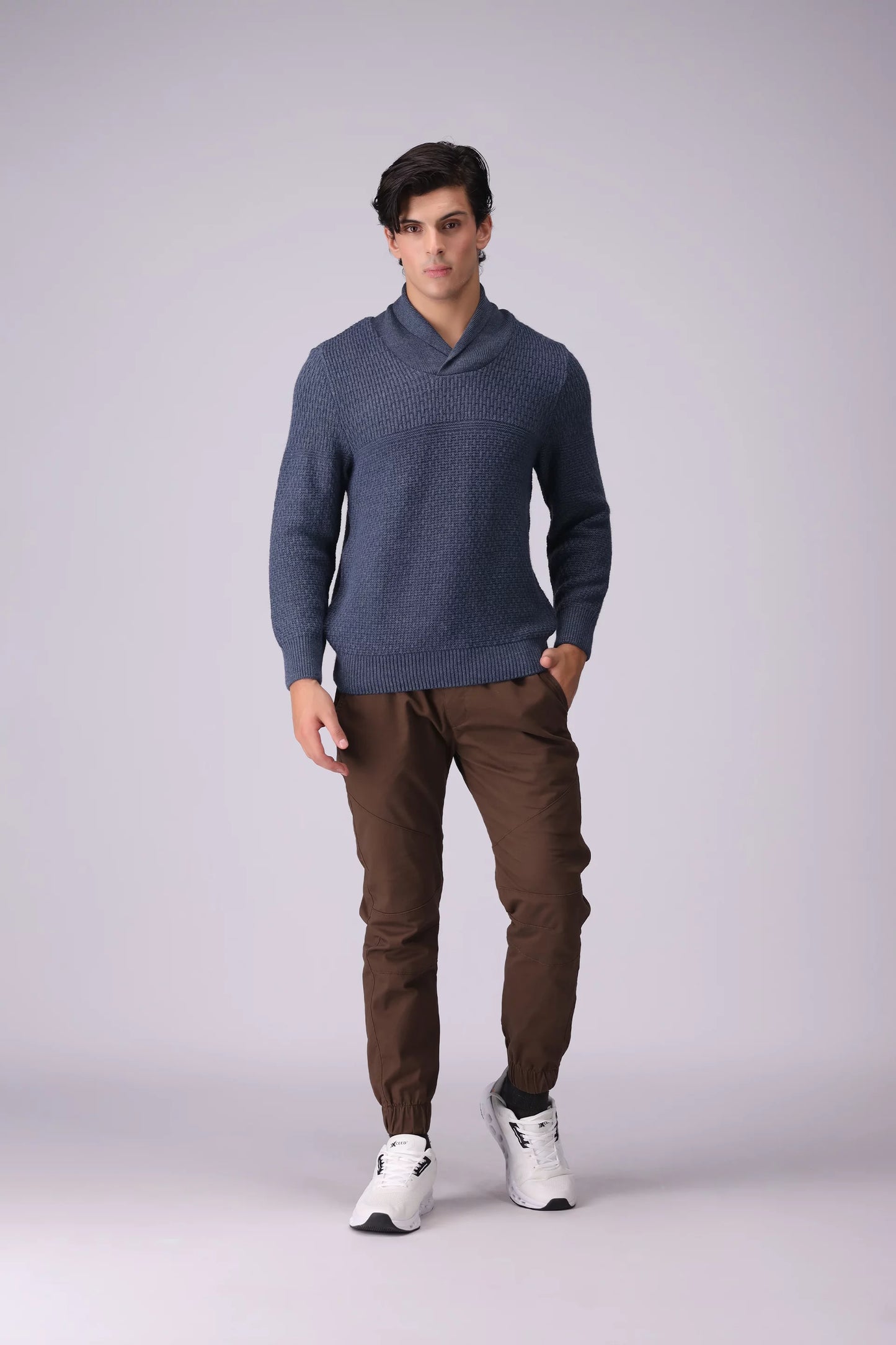 Design Details: Shawl neck, straight-cut hem, rib trims, knitted pattern