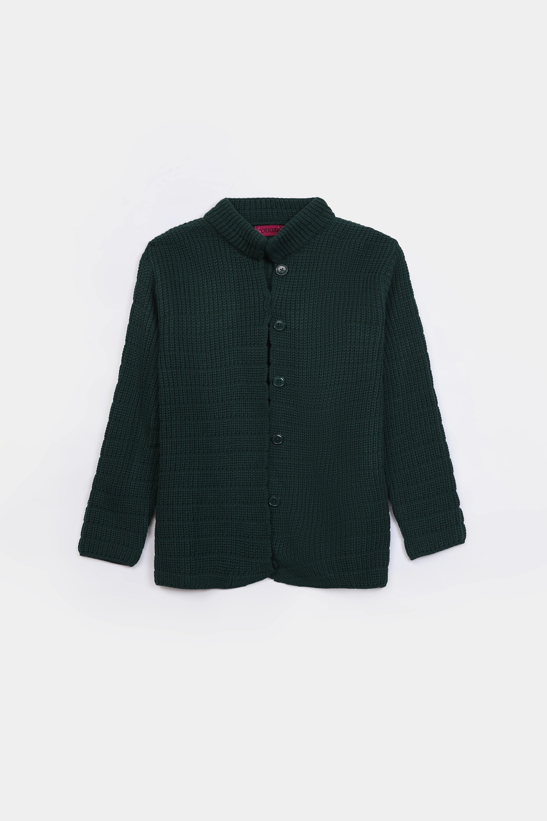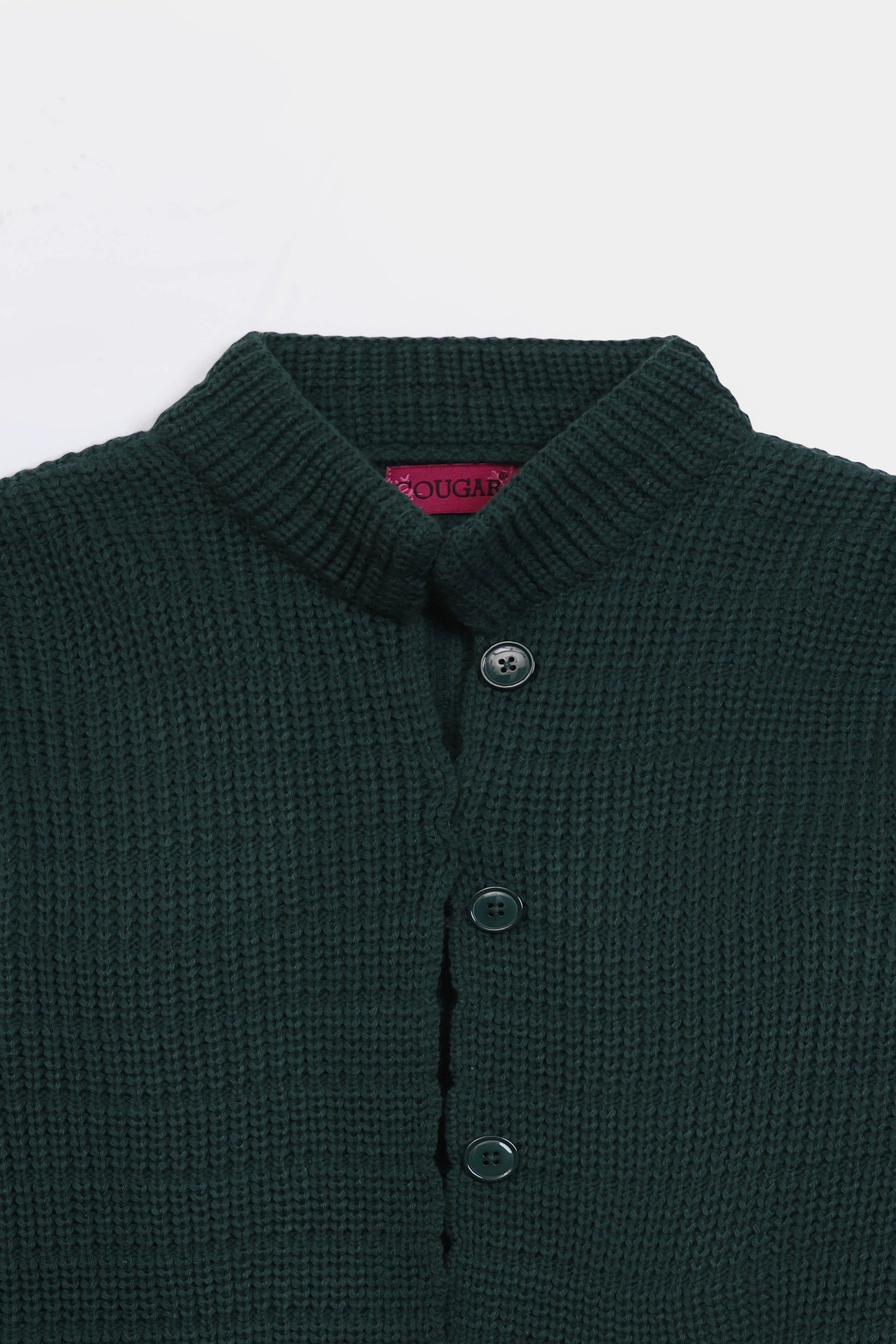 Design Details: Mock neck, front button-closure, full sleeves, thick ribbed knit